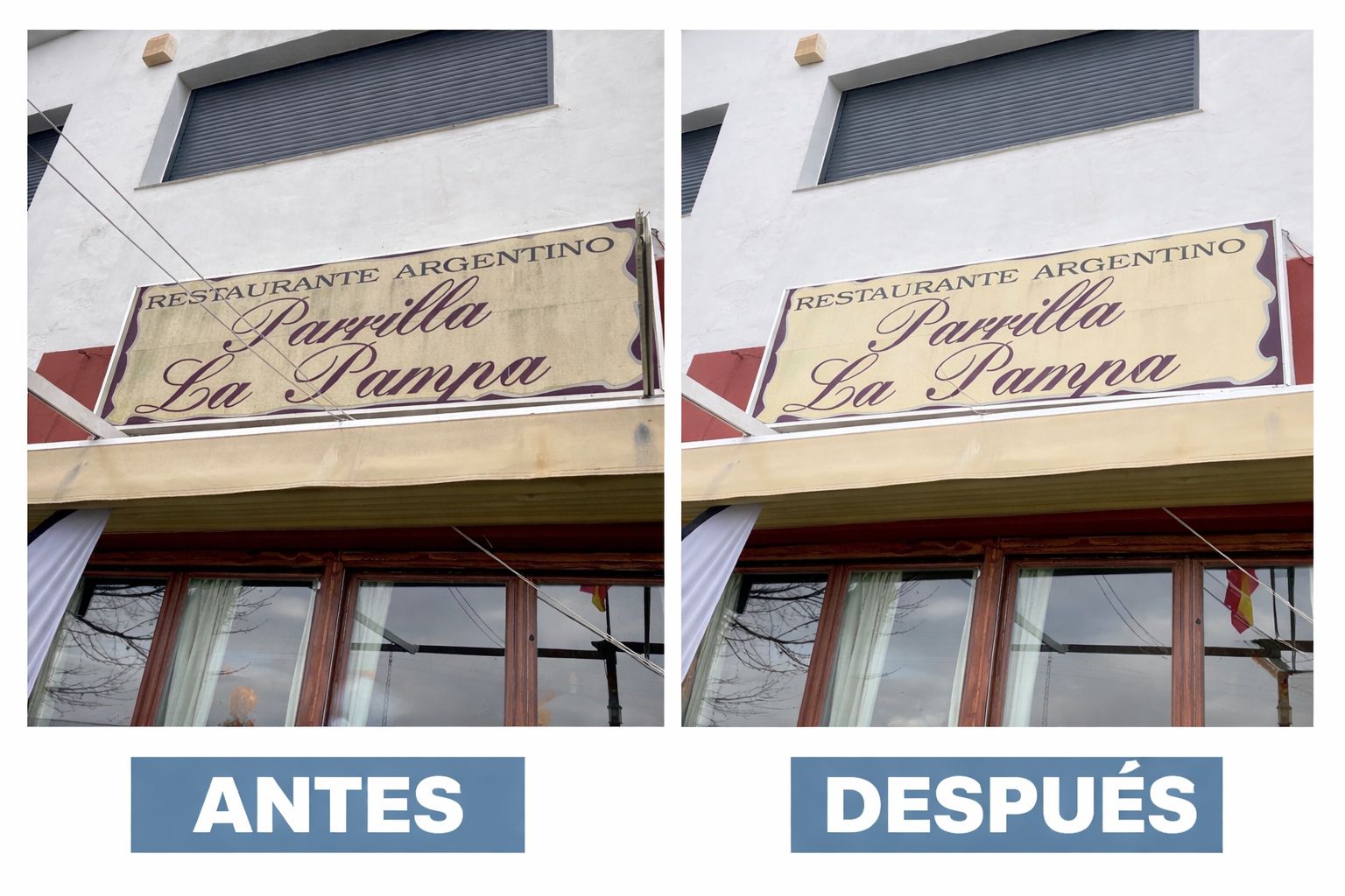 Limpieza de carteles y escaparates con sistema de agua osmotizada para un resultado perfecto sin necesidad de secado y utilizando solo agua 100% pura. Pruebe la innovación en limpieza con agua de osmosis, sin necesidad de alquilar costosos aparatos elevadores y reduciendo el riesgo de utilizar medios de descuelgue. Alcanzamos los 16m de altura.